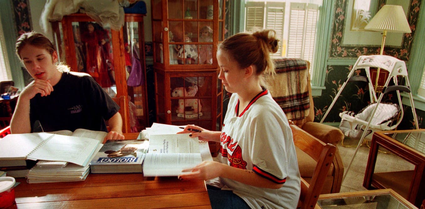 Suzi Ailes, right, and Kris Smith study schoolwork for SusQ-Cyber Charter School in their home in Milton, Pennsylvania. AP Photos/ George Widman