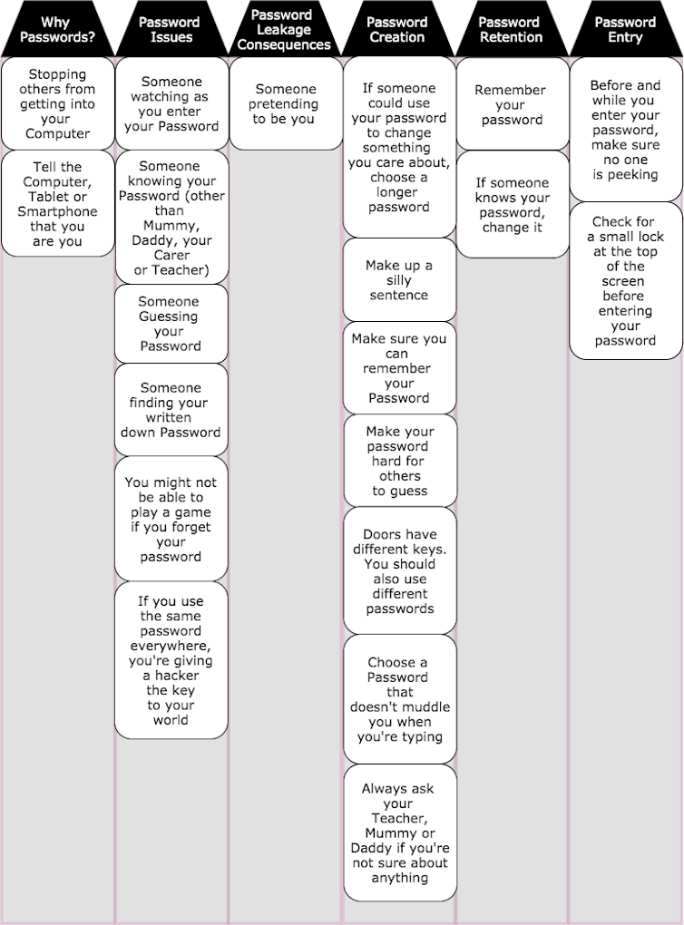 Hence, children’s books are probably not the best tool for parents to use to teach the latest password “best practice” principles. The sets of “best practice” principles we have derived should help adults to teach the principles to the children in their care in an age-appropriate way.